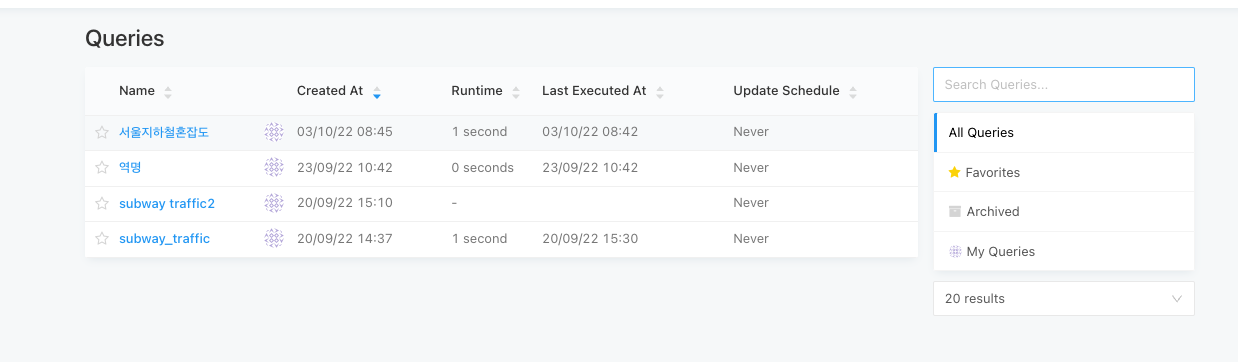 상단메뉴에서 Queries 를 클릭하면 만들어 놓은 Query 들이 보입니다.